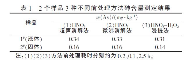 文獻采用HNO3-H2O2浸提2h,試液定容1000mL再分取一定量試液上機測試,砷濃度被稀釋導致樣品中目標物未檢出;定容后加入濃鹽酸及還原劑,給測量結果引入新的誤差。實驗采用3種前處理方法均為進一步減小試液定容體積(100mL),依次加入濃鹽酸及還原劑后再用水稀釋至刻度。采用3種前處理方法測定了2個代表性樣品(液體和固體)的砷含量,結果見表1。
