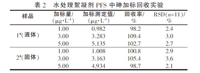 對1#和2#樣品進行加標回收實驗,3個添加水平的回收率為98.2%~109.4%,RSD均不大于3.6%,見表2。將方法應用于云南省各相關企業送檢的I類PFS中As含量測定,其中液態樣品14份、固態樣品4份,測定結果均在0.15~0.45mg/kg范圍內,低于GB14591—2006《水處理劑:聚合硫酸鐵》的規定(Ⅰ類為飲用水用,液態PFS砷標準限值為1mg/kg,固態PFS砷標準限值為2mg/kg)。