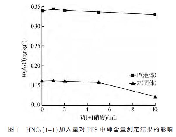 3種前處理方法得到的測定結果無明顯差異,方法(3)結果略低。考慮實驗耗時、分析效率、實驗成本等因素,方法(1)采用100mL比色管直接稱樣、很聲消解、定容上機,簡便快速有效,故選擇方法(1)對PFS中砷含量進行測定。2.2HNO3溶液加入量選擇PFS遇水很易水解,加入一定量硝酸溶液能使樣品消解完全。采用方法(1)對樣品進行前處理,考察了加入不同體積的HNO3(1+1)對砷含量測定結果的影響,結果見圖1。加入1mLHNO3(1+1)時可滿足試樣完全消解的要求。