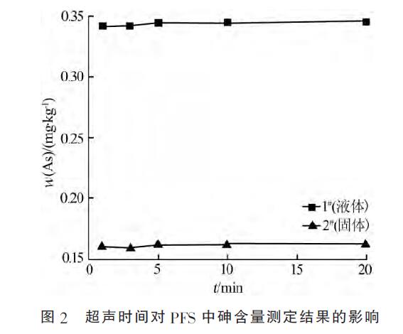 稱取1gPFS,考察很聲時間對PFS中砷含量測定結果的影響,結果見圖2。很聲5min時試樣消解已達完全,故選擇很聲時間為5min。