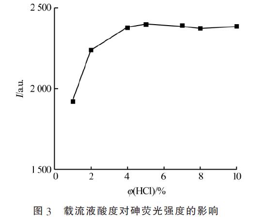 根據相關資料,硝酸對熒光強度有負干擾作用,有可能被樣品機體還原成亞硝酸根,降低預還原劑作用,因此實驗選取HCl作為介質。HCl酸度對氫化物反應的影響見圖3。由圖3可知,選擇體積分數為5%鹽酸作為載流溶液時具有較好的分析結果。