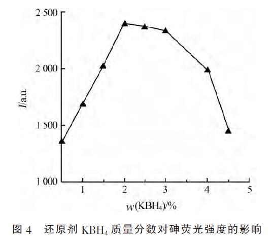 質量分數KBH4具有強還原性,常溫下能與水發生反應。作為氣態氫化物發生體系的還原劑,對實驗結果的靈敏度、準確度均產生非常大的影響,濃度低時氣態物難形成,濃度高時產生過多的氫氣反而會引起氣相干擾,降低靈敏度。保持其他條件不變,選取不同質量分數的KBH4測定標準溶液的熒光強度,結果見圖4。選取KBH4質量分數為2.0%,可以滿足As測定的要求。