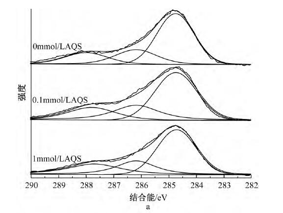 為了解AQS的存在是否影響Cd2+的吸附機理,采用XPS對體系中的C、O、Cd元素進行分析。經過XPSPeak4.1軟件分峰處理后,圖4a中C1s可擬合出3個峰,其中:284.8eV為C—C/C—H,是表面污染碳[21],286.2eV為C—OH,是MR-1菌表面的醇羥基或醚,287.7eV為C—OOH,是MR-1菌表面的羧基;表明MR-1菌體表面官能團主要為羧基和醇羥基或醚。從圖4b中C1s可以看出:反應平衡后所有體系中C—OH和C—OOH峰面積比均有所降低,說明醇羥基或醚和羧基均參與了反應,而無AQS的體系峰面積比降幅更小,推測由于體系生成的二次礦物較多,增加了溶液中Cd2+的傳質阻力,阻擋了菌體表面與溶液中游離離子的絡和。圖4cO1s中可擬合出3個峰:530.1,530.9,532.2eV分別對應絮體中的Fe-O、MR-1菌表面的羧基、醇羥基或醚。圖4dO1s中,所有體系在531.1eV處均出現新峰Fe—OH,且有AQS體系的Fe—OH峰面積比略小于無AQS體系,與XRD分析結果吻合,說明所形成的二次礦物中針鐵礦和磁鐵礦量(結晶度稍差)少于無AQS體系,且Fe—O發生了一定的位移,其中Fe—O包括未被還原絮體中的Fe—O和二次礦物中的Fe—O;另一個新峰為531.7eV處的Cd—O,且0.1mmol/LAQS峰面積比較大,原因是反應前期釋放出來的Cd2+更多,菌體表面有機官能團和二次礦物表面存在大量的羥基位點絡合了更多的Cd2+;所有體系中C—OH均發生了一定的位移,結合能均有增加,原因是C—OH中的O含有孤對電子,能與Cd共享電子從而發生配位絡合形成Cd—O,從而降低了O原子周邊的電子云密度。圖4e中Cd3d,404.59eV處為Cd—O,405.4eV處為PFS混凝Cd2+產生的峰[26]。而從圖4f中Cd3d可以看出:有AQS體系中Cd—O峰面積比無AQS體系大,與O1s圖譜中的Cd—O一致,其中Cd—O包括二次礦物和菌體表面有機官能團結合Cd2+形成的Cd—O。