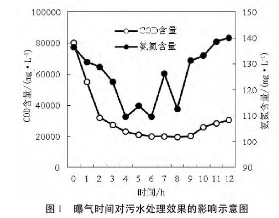 取1組6個(gè)250mL的錐形瓶,分別向其中加入100mL的待處理污水,然后向該污水中加入相當(dāng)于污水體積1%的菌液,即1mL的菌液,并且對(duì)污水進(jìn)行曝氣處理,曝氣量為4L/min,每隔一小時(shí)取樣記錄污水中的COD與氨氮含量,持續(xù)12h,通過(guò)觀察污水中COD與氨氮含量的變化,從而確定較佳的曝氣時(shí)間。
