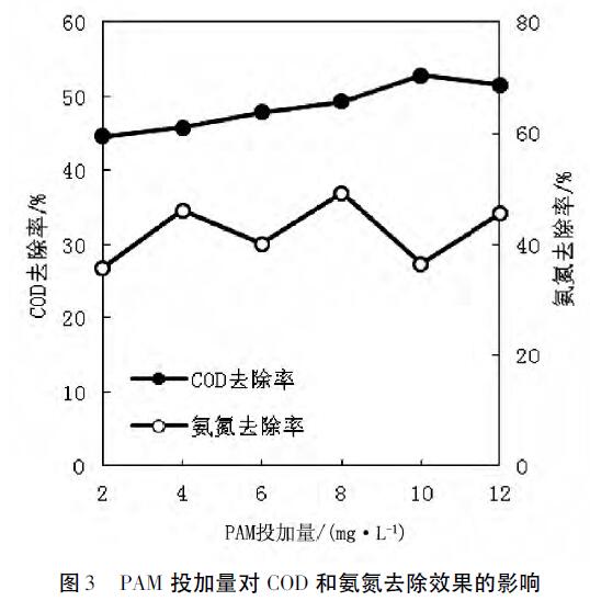 按照PFS的較佳投加量600mg·L-1的標(biāo)準(zhǔn)進(jìn)行投加,通過(guò)改變助凝劑PAM的投加量,測(cè)定絮凝后水樣中COD與氨氮的含量,考察助凝劑PAM對(duì)絮凝效果的影響,結(jié)果如圖3所示。
