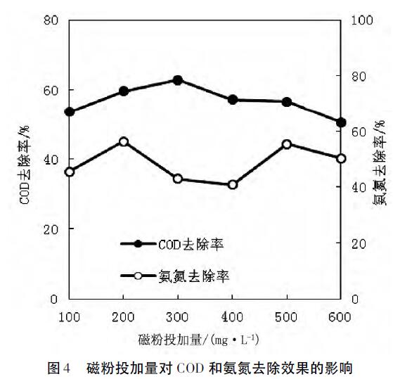 如圖4所示,磁粉的投加量為300mg·L-1時(shí),COD的去除率達(dá)到了較高值,為62.8%,比只加入PFS和PAM時(shí)的COD去除率高10.0%,這說(shuō)明加入磁粉有利于提高絮凝效果。磁粉通過(guò)吸附-電中作用,同水中的懸浮顆粒一起做為絮體形成凝結(jié)核,形成磁性絮體,由于其重力較大,沉降速率加快,提高了絮凝效果。當(dāng)磁粉投入量過(guò)高時(shí),絮凝效果下降,顯然磁粉量加入量過(guò)高,會(huì)造成磁粉吸附其他的污染物,降低了COD的去除率。如圖4所示,隨著磁粉的投加量發(fā)生變化,水體氨氮的去除率呈現(xiàn)一個(gè)不規(guī)則的變化,說(shuō)明磁粉的投加量與廢水中氨氮的去除沒(méi)有明顯的相關(guān)性,所以磁粉的較佳投加量應(yīng)該由COD的去除率所決定,確定為300mg·L-1。